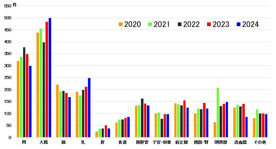 注:各臓器別に集計した登録数になります。「大腸」は結腸と直腸を併せた症例数となっています。「頭頚部」には咽頭・喉頭や甲状腺等の耳鼻咽喉科領域のがんが含まれます。「造血器」には悪性リンパ腫や白血病などのいわゆる血液のがんが含まれます。「その他」のなかには脳腫瘍や皮膚がんなど、明記されている臓器以外のがんが含まれています。