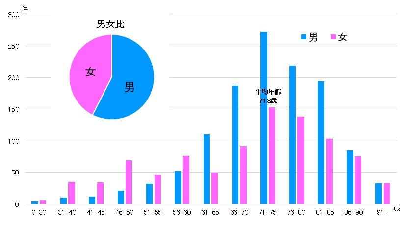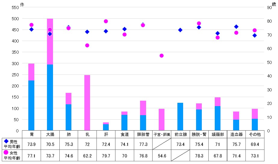 当院のがん症例の平均年齢は全体で71.3歳、男性は73.1歳、女性は68.9歳でした。男性特有のがんである前立腺がんの平均年齢が73.4歳であるのに対し、女性特有の子宮がん・卵巣がんの平均年齢は54.6歳であり、他のがんと比較するとその差が大きいことに特徴があります。女性の子宮がん・卵巣がんの平均年齢が他のがんに比べて低いのは、子宮頚がんの平均年齢が45.5歳と若年で診断される症例が多いためです。