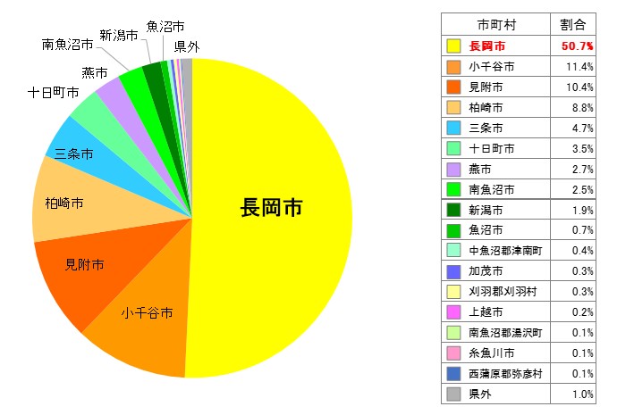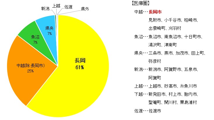 2024年に当院で登録されたがん症例の62.8%が、診断や治療を目的として当院に紹介された症例になります。その多くは長岡市内の医療機関からの紹介ですが、同じ中越医療圏、隣接する県央、魚沼医療圏の医療機関からも多くの紹介をいただいております。