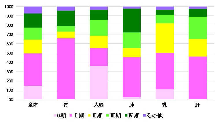 当院のがん全体では早期がんと言われるⅠ期までが半数近くを占めています。手術の対象となるのはだいたいⅢ期までとなり、Ⅲ期の一部とⅣ期では手術以外の薬物療法や放射線治療、緩和療法等が主に行われます。(臓器によって違いはあります)「その他」には白血病などの造血器腫瘍や、他の医療機関で既に治療が行われて紹介された症例が含まれます。