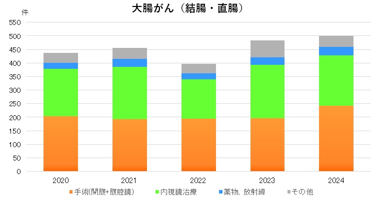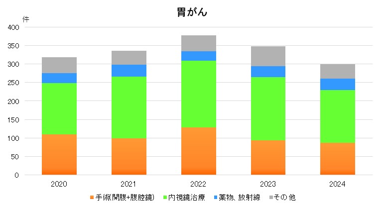 手術症例は外科で行われる開腹手術と腹腔鏡手術を併せた症例数となっています。この中には、手術前に腫瘍を小さくする目的で行われた薬物療法、手術後に再発予防目的で行われた薬物療法の症例も含まれています。内視鏡治療は消化器内科で行われ、薬物療法、放射線療法、その他は主に消化器内科と腫瘍内科で行われます。