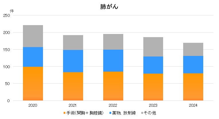 肺がんの手術は呼吸器外科で行われており、手術対象となる症例のほぼ全例を胸腔鏡手術で行っています。また、胃がん、大腸がんと同様に、手術後に再発予防を目的とした薬物療法の症例も含まれています。手術を行わない薬物療法や放射線療法は呼吸器内科が主に治療を行っています。