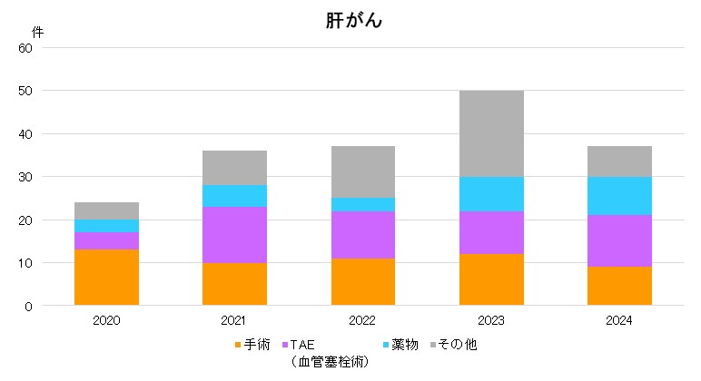 肝がんの手術症例の中には、開腹手術と腹腔鏡手術が含まれています。また、術後に薬物療法が行われた症例も含んでいます。「TAE(血管塞栓術)」は肝動脈塞栓療法といって、肝臓の動脈に栓をして、癌細胞に栄養を送らせない治療(いわゆる兵糧攻め)のことです。この症例数の中には、TAEと抗がん剤注入を併用した治療「TACE」も含まれています。当院では、手術は外科が行いますが、TAE、TACEは主に消化器内科、全身の薬物治療は消化器内科と腫瘍内科が治療を担っております。