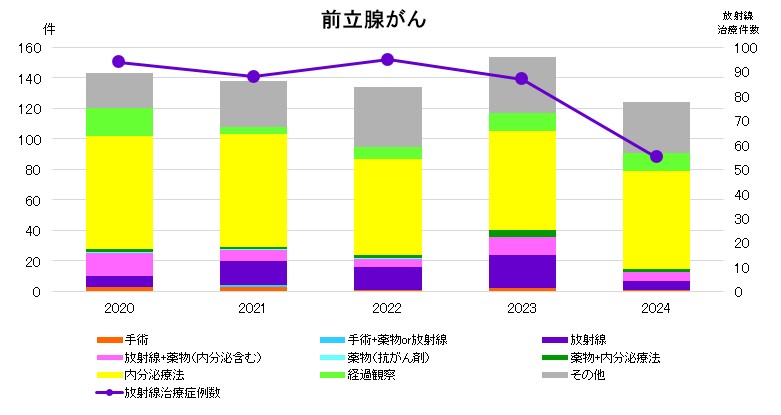 前立腺がんは他のがんと異なり、治療方法が多岐にわたります。特に、内分泌療法と呼ばれる治療が主となり、男性ホルモンの分泌を抑える薬剤の使用や、手術ではありますが精巣の摘出術がこの治療に含まれます。また、PSAの値を観察して、投薬や注射、手術等を行わない「経過観察」が行われるのも、他のがん治療と大きく異なる点です。また、「その他」症例の中には、当院で行っていない治療(例として重粒子線やロボット支援手術等)の実施施設への紹介も含まれています。